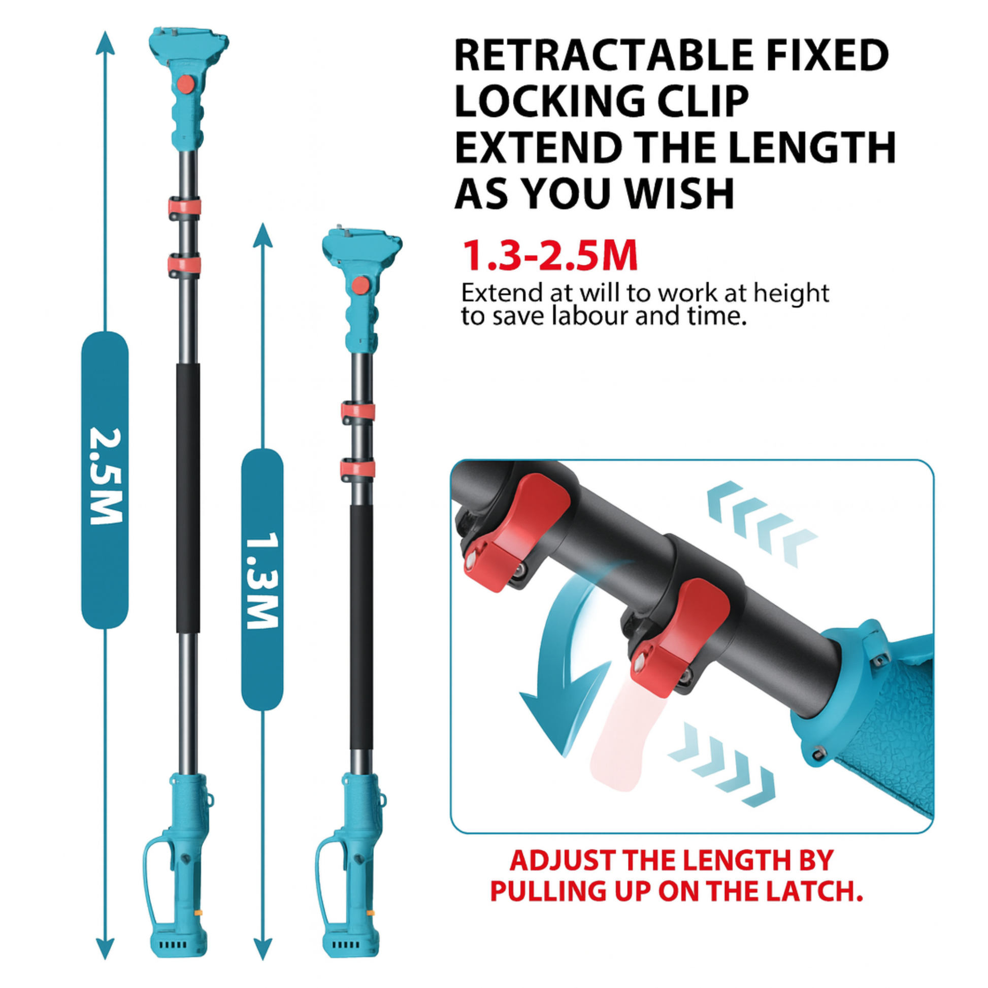 The 2.5 m telescopic pole and handheld design make it perfect for trimming tall branches — no need for ladders or extra help.